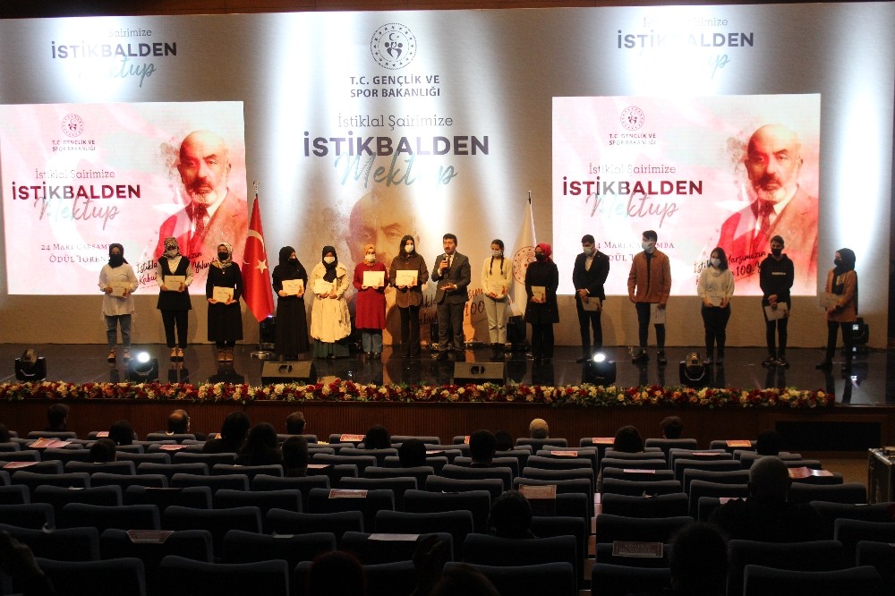 Gençlik ve Spor Bakanlığı tarafından İstiklal Marşı´nın Kabulünün 100´üncü yılı ve Mehmet Akif Ersoy´u Anma Etkinlikleri kapsamında düzenlenen "İstiklal Şairimize İstikbalden Mektup Yarışması" ödül töreni, Bakanlık Merkez Binasında düzenlenen bir etkinlikle gerçekleştirildi. 13-17 yaş kategorisinde bin 447, 18-25 yaş kategorisinde de bin 565 olmak üzere toplamda 3 bin 12 gencin katıldığı yarışmada ilk 20´ye giren yarışmacılara ödüller verildi. Ödül törenine, Gençlik ve Spor Bakan Yardımcısı Halis Yunus Ersöz katıldı.
