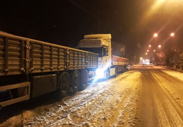 Akşam saatlerinde kar yağışının etkili olduğu Doğanşehir ilçesinde Malatya-Adıyaman kara yolunda iki yönde ağır tonajlı araçların ve otobüslerin geçişi kontrollü sağlanıyor.
