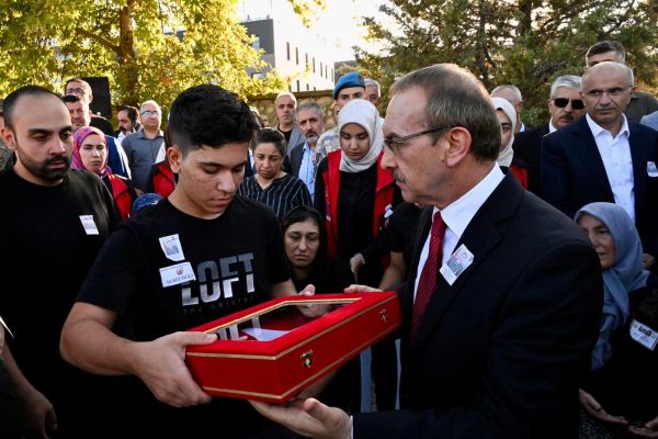 Vali Yavuz, Aziz Şehidimizin naaşının tabutuna sarılı Türk Bayrağını ve fotoğrafını şehidin ailesine