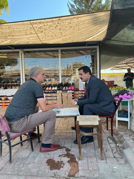 Parkı’nda yapılacak çalışmalar hakkında esnafa bilgi verdi. Depremde zarar gören caminin inşaatı