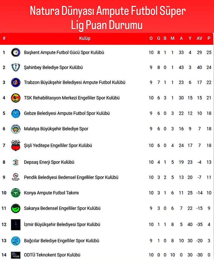 Bir maç eksiği bulunmasına rağmen 18 puana ulaşan Malatya ekibi, ligdeki 6. sıradaki yerini korudu. Türkiye Ampute Süper Ligi’nde üst sıraları yakından takip eden Malatya Büyükşehir Belediyespor, şampiyonluk yarışından kopmayarak taraftarlarına umut verdi.