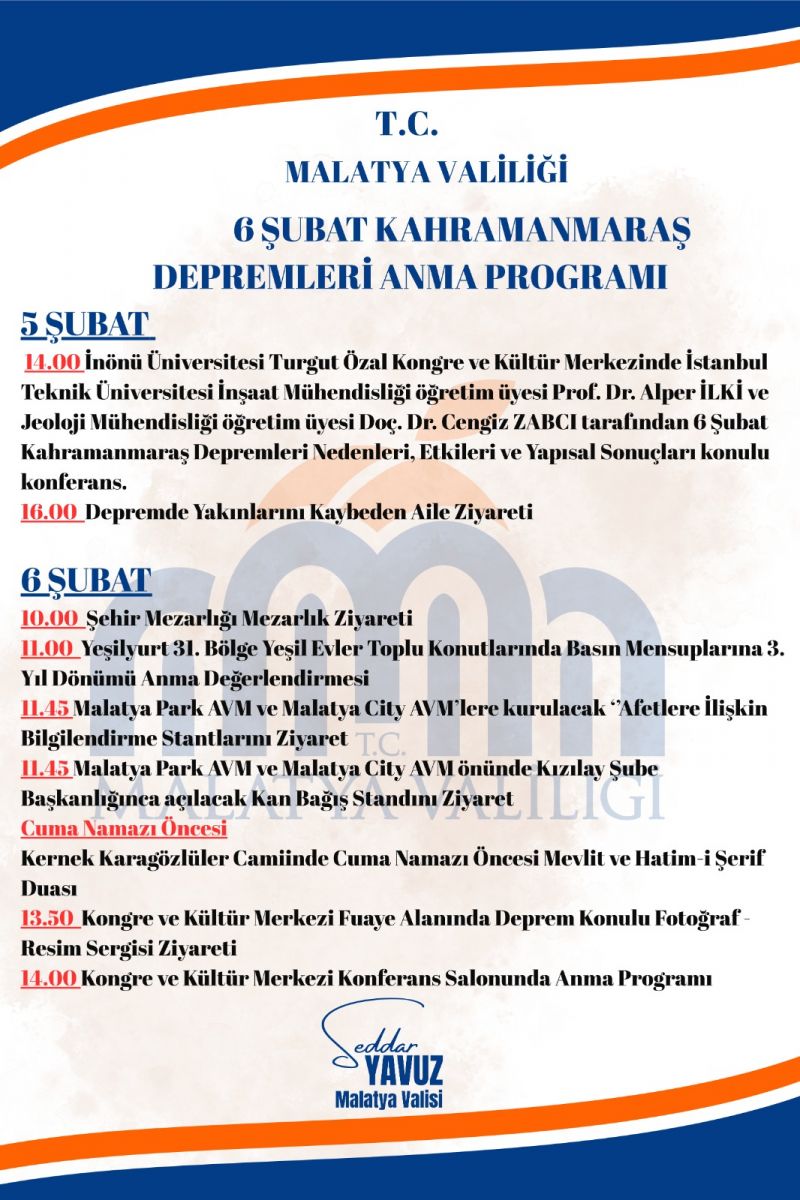 Malatya Valisi Seddar Yavuz koordinesinde gerçekleştirilecek anma programı kapsamında, depremin bilimsel sonuçları tartışılacak, şehitler dualarla yâd edilecek ve deprem konulu sergiler açılacak. Program, 5 Şubat’ta akademik bir konferansla başlayıp 6 Şubat’ta geniş kapsamlı anma etkinlikleriyle devam edecek.